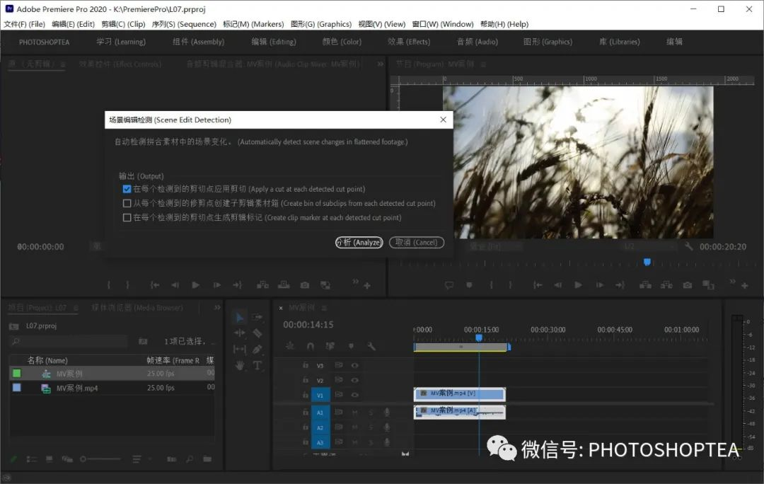 在时间轴面板的剪辑上右击,选择“场景编辑检测” Scene Edit Detection,或者Pr菜单:剪辑/场景编辑检测。