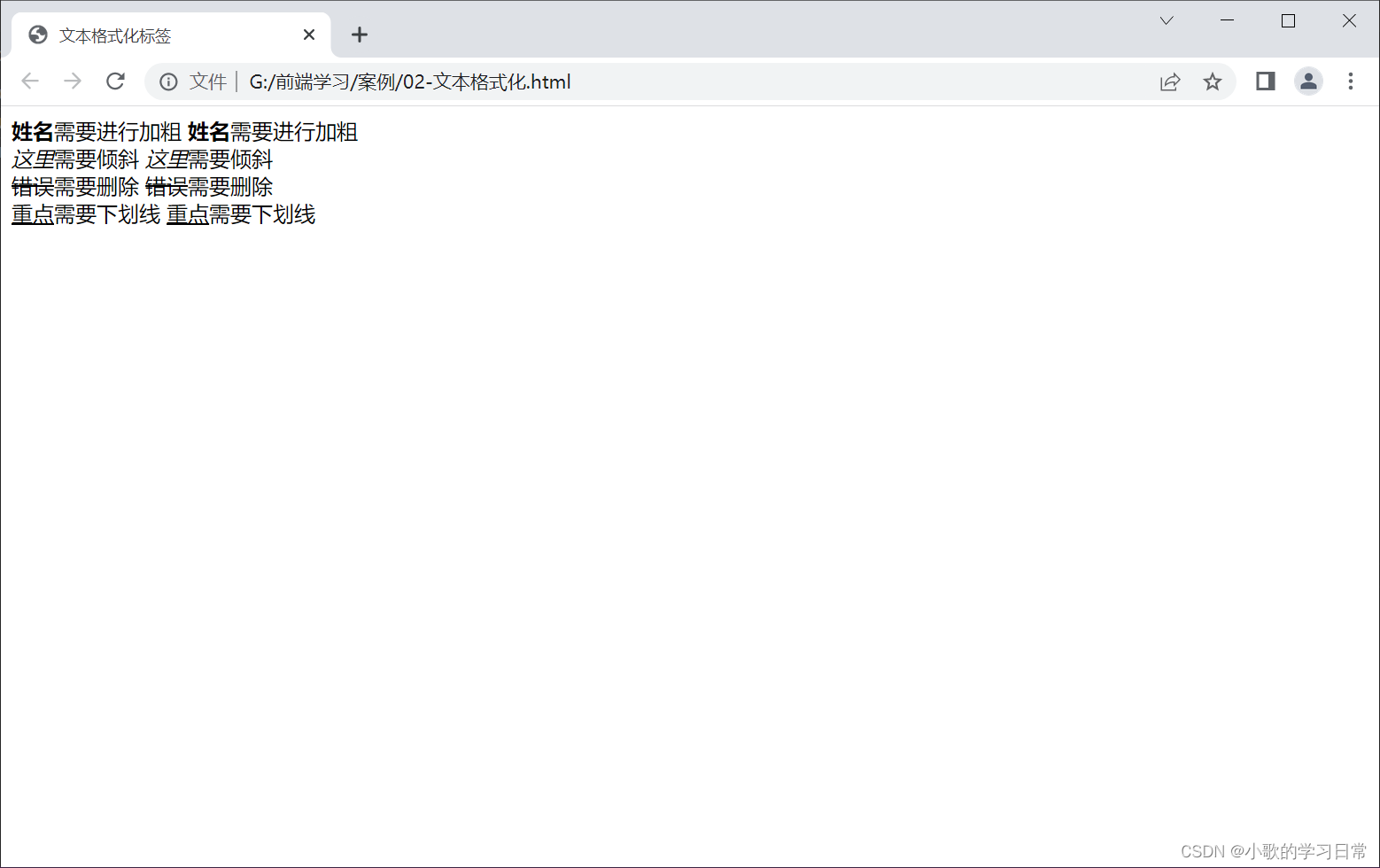 在网页中,需要显示文字设置粗体、斜线、下划线等效果,这时就需要HTML中的文本格式化标签,使文字以特殊的方式显示。
