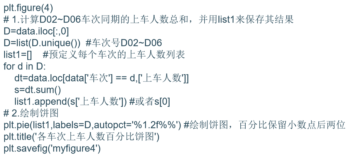 5.与Matlab类似,饼图的绘制函数为pie(X,Y,[可选项]),其中X表示待绘制的数据序列,Y表示对应的标签,可选项表示绘图设置。这里常用的绘图设置为百分比的小数位,可以通过autopct属性类设置。这里先计算D02~D06共5个车次同期的上车人数,然后绘制其饼图展示出来,示例代码如下: