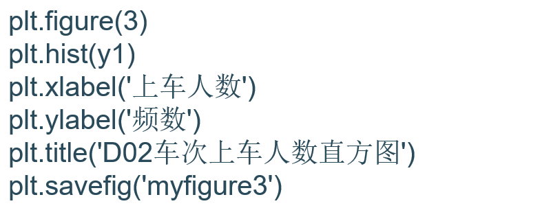 4.与Matlab类似,直方图的绘图函数为hist(X,[可选项]),其中X表示横轴坐标数据列,可选项为绘图设置。绘图设置详细使用方法可以参考图4-9通过help(plt.hist)进行查询,一般情况下我们采用默认设置即可(缺省方式,具体见示例代码)。需要注意的是,直方图中的Y轴往往表示对应X的统计频数。绘制D02车次直方图示例程序如下: