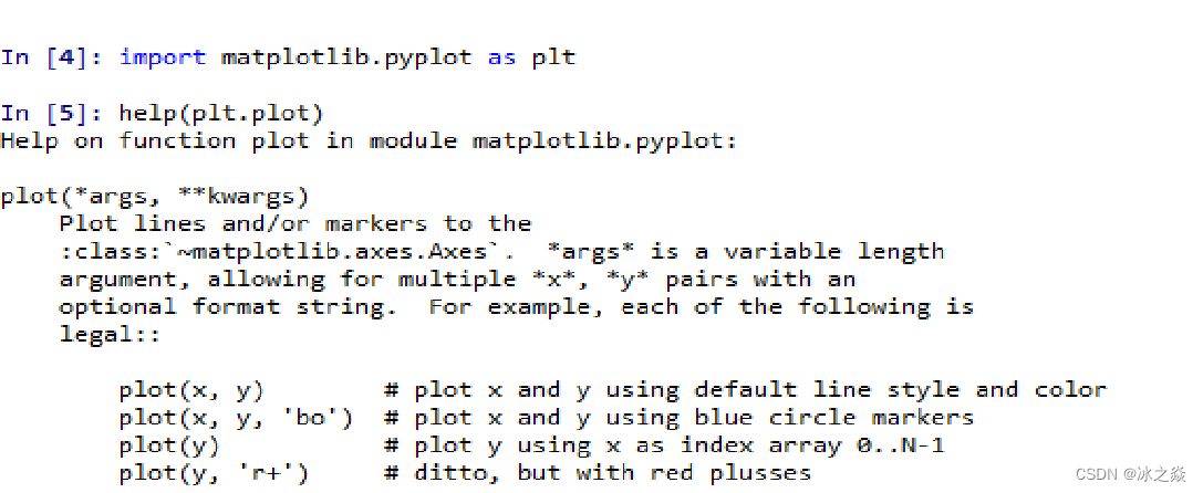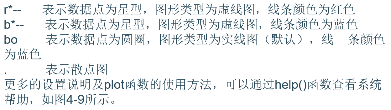图4-9显示了先执行导入pyplot 包命令:import matplotlib.pyplot as plt,接着以待查询函数plt.plot为参数,调用help()函数,按Enter键即可获得plt.plot()函数的详细使用方法。