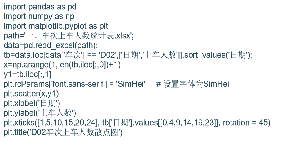 1.散点图又称为散点分布图,是以利用坐标点(散点)的分布形态反映特征间的相关关系的一种图形。散点图的绘图函数为:scatter(x, y, [可选项])。其中x表示横轴坐标数据列,y表示纵轴坐标数据列,可选项包含颜色、透明度等。使用scatter函数绘制D02车次每日上车人数散点图示例代码如下: