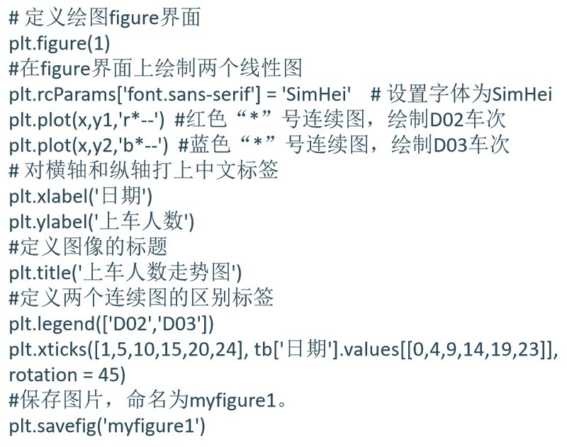Matplotlib绘制的常用图形包括散点图、线性图、柱状图、直方图、饼图、箱线图和子图。本节中绘图使用的数据文件为:车次上车人数统计表.xls,其表结构如表4-2所示。