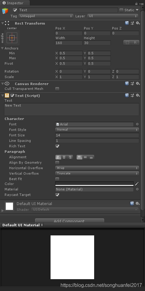 Rect Transform:用于控制UI物体的基本属性,Canvas Renderer:画板UI渲染器,必备且不可编辑。