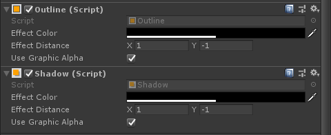 在Text游戏对象上添加Outline 和 Shadow ,即表示支持文本的描边和阴影。可以设置它们的颜色以及距离。