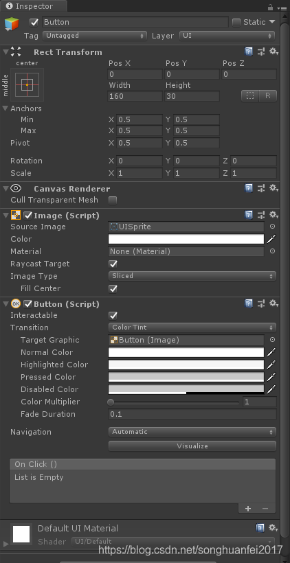 OnClick事件列表 :可以拖拽物体或脚本,指定方法。(不建议)