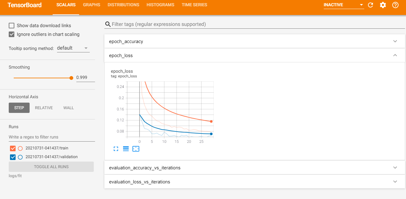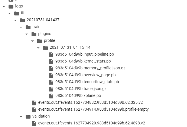 keras API 训练模型时,我们创建了一个 tensorboard 回调,以确保将指标记录在指定的目录中。这里保存到logs/fit