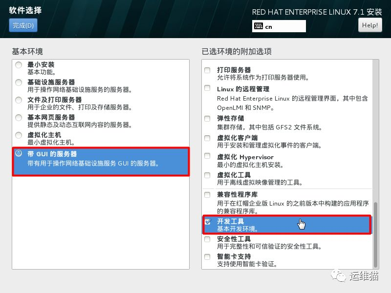 8)软件包选择,初学者建议选择带GUI的服务器,同时把开发工具相关的软件包也安装上,然后单击完成