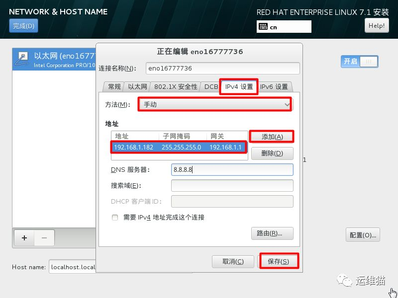 10)网络配置,开启以太网连接,将会自动获取IP地址,如果要手动配置,单击