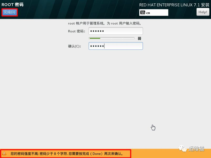 Root密码配置,如果密码过于简单,需要单击两次完成进行确认