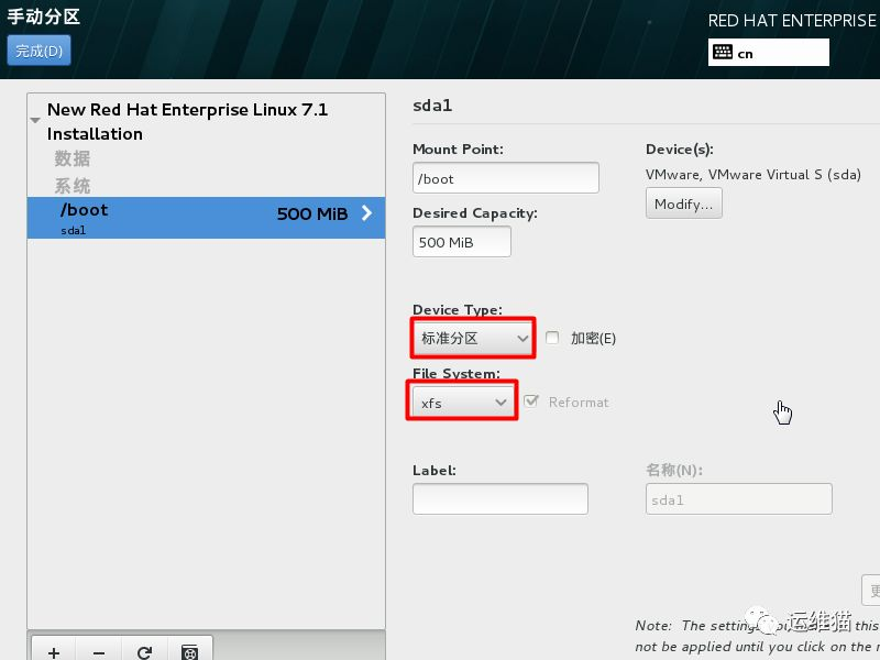 设备类型选择默认的标准分区,文件系统类型为xfs,RHEL7支持brtfs,生产环境不建议选择,btrfs文件系统目前技术尚未成熟,只是作为一种前瞻技术