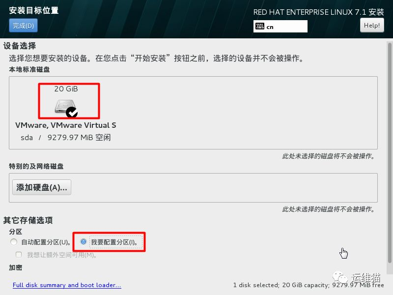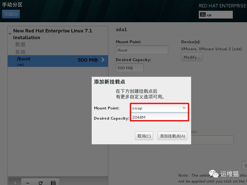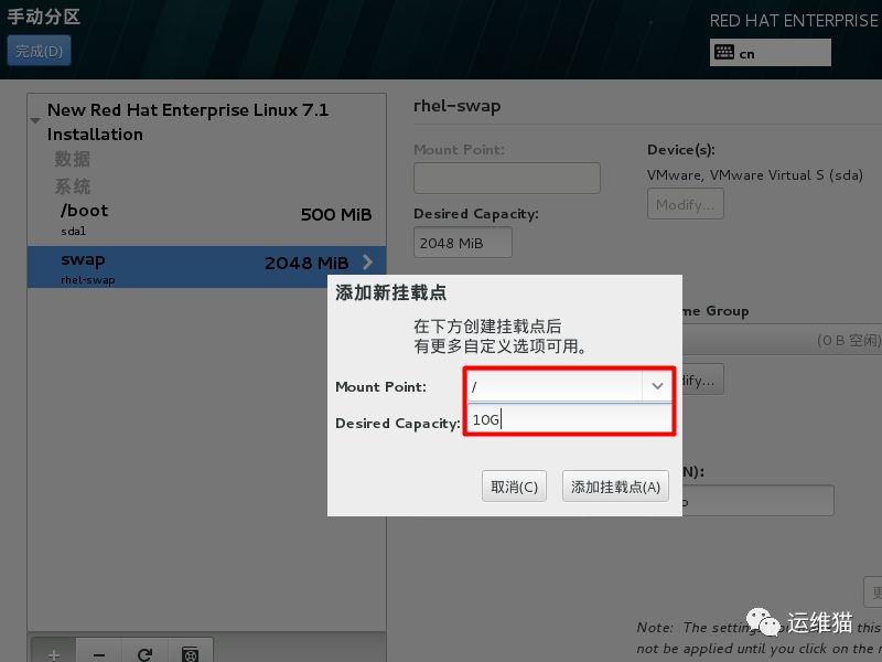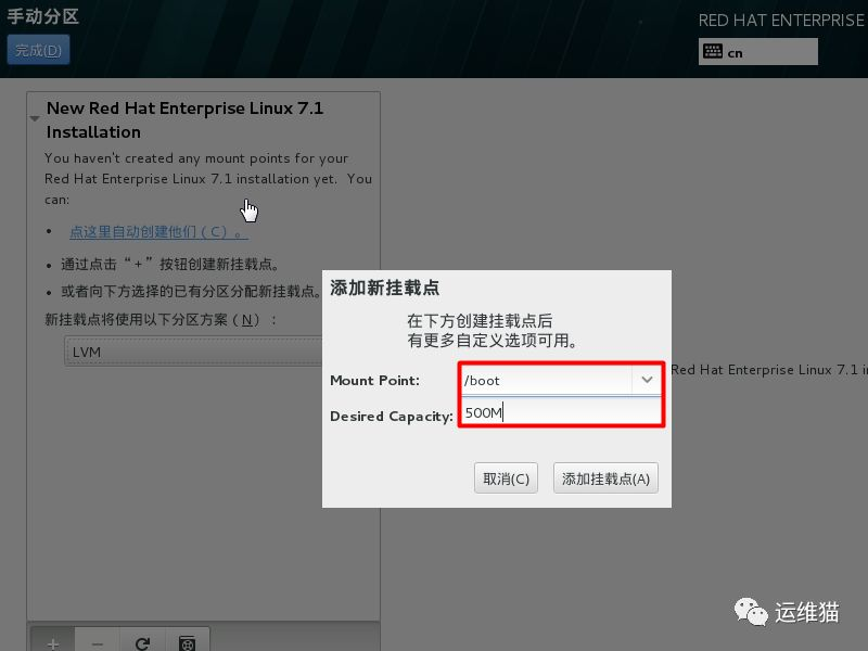 选择-其它存储选项-分区-我要配置分区,点左上角的“完成”,进入下面的界面,在分区方案有标准分区,btrfs,LVM,LVM简单配置,这里默认LVM就可以,然后单击创建新的分区,分区提前规划好,一般swap分区为物理内存的1.5~2倍,/boot分区500M,/分区10G,实际工作中可以创建数据分区,一般把数据和系统分开