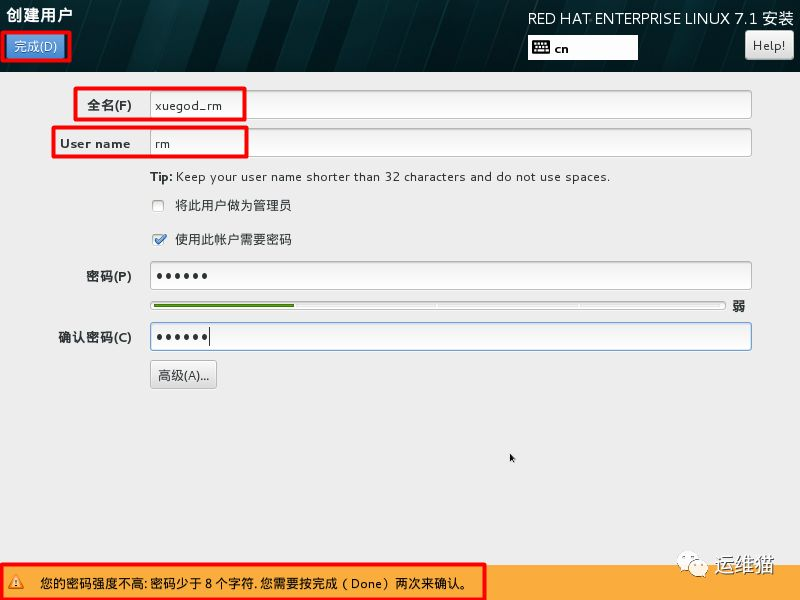 创建普通用户,如果密码过于简单,需要单击两次完成进行确认