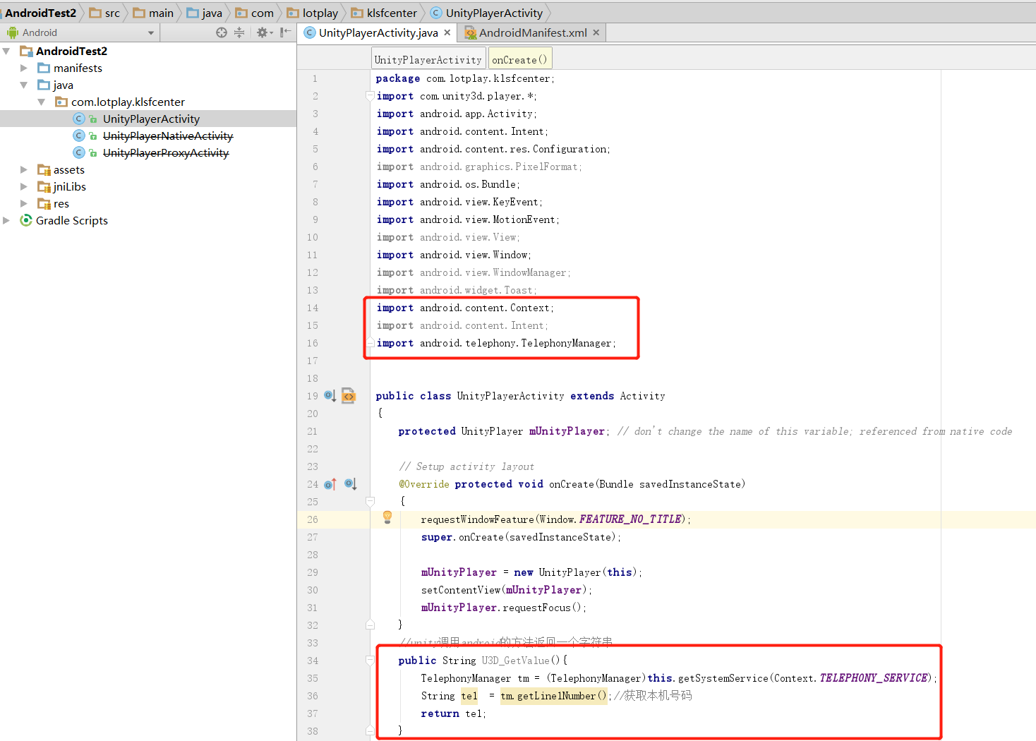 //unity调用android的方法返回一个字符串public String U3D_GetValue(){TelephonyManager tm = (TelephonyManager)this.getSystemService(Context.TELEPHONY_SERVICE);String te1 = tm.getLine1Number();//获取本机号码return te1;}