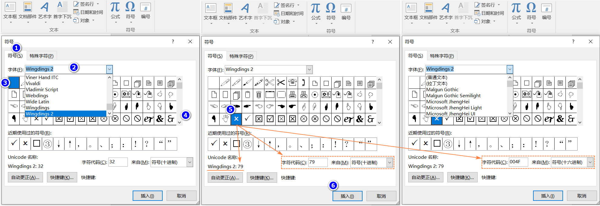 在弹出的“符号”对话框中,选择符号 | 选择字体(F): Wingdings 2,