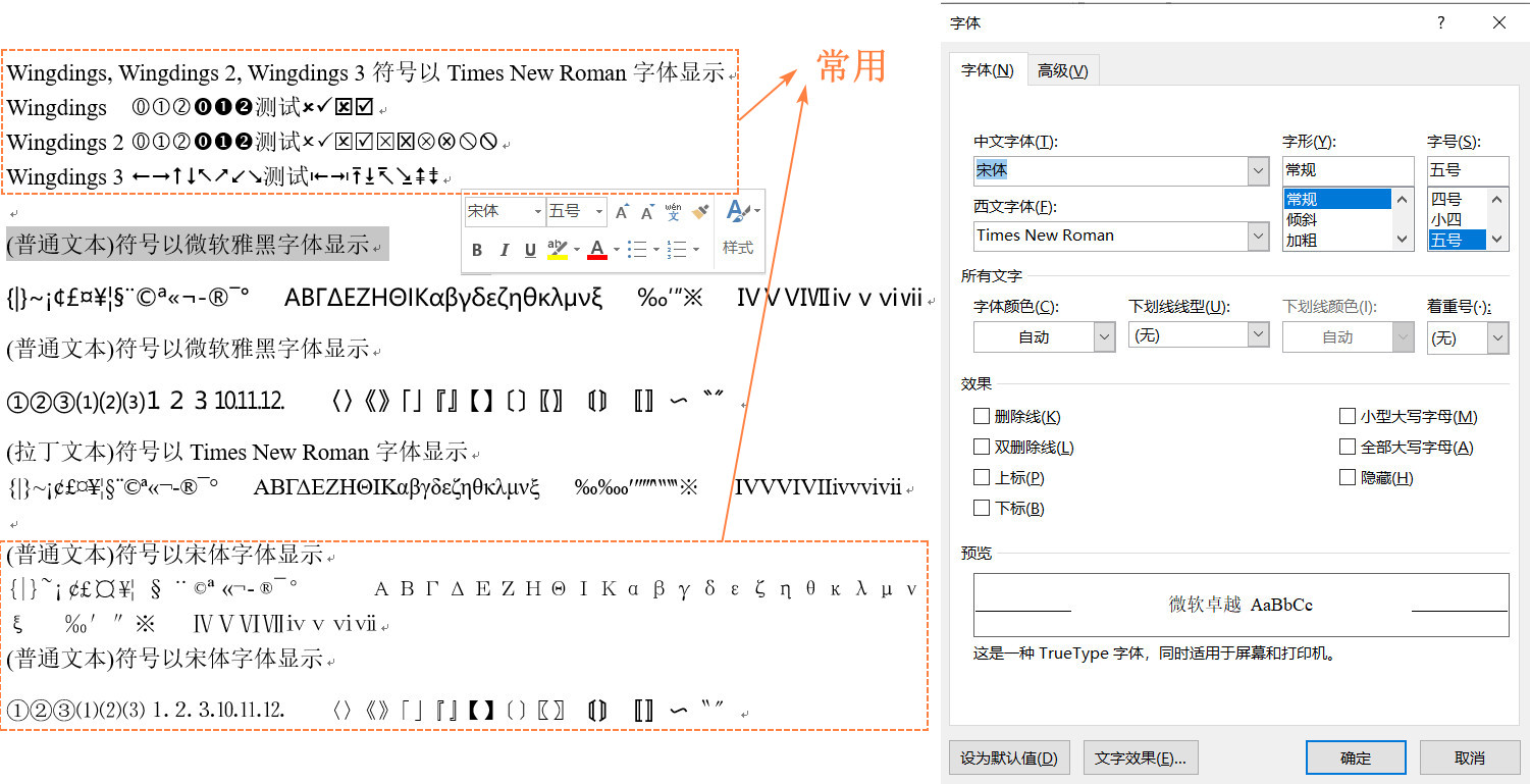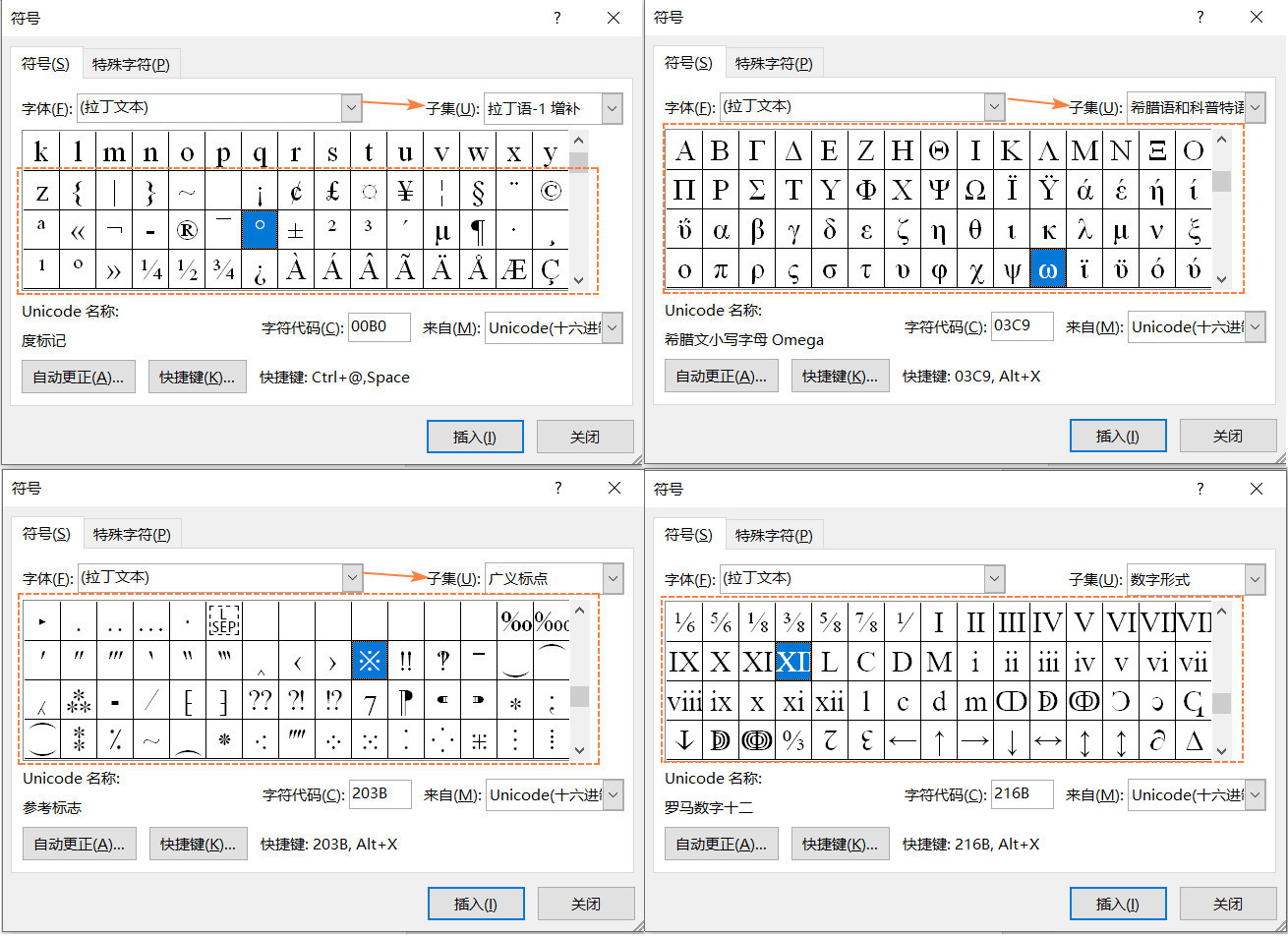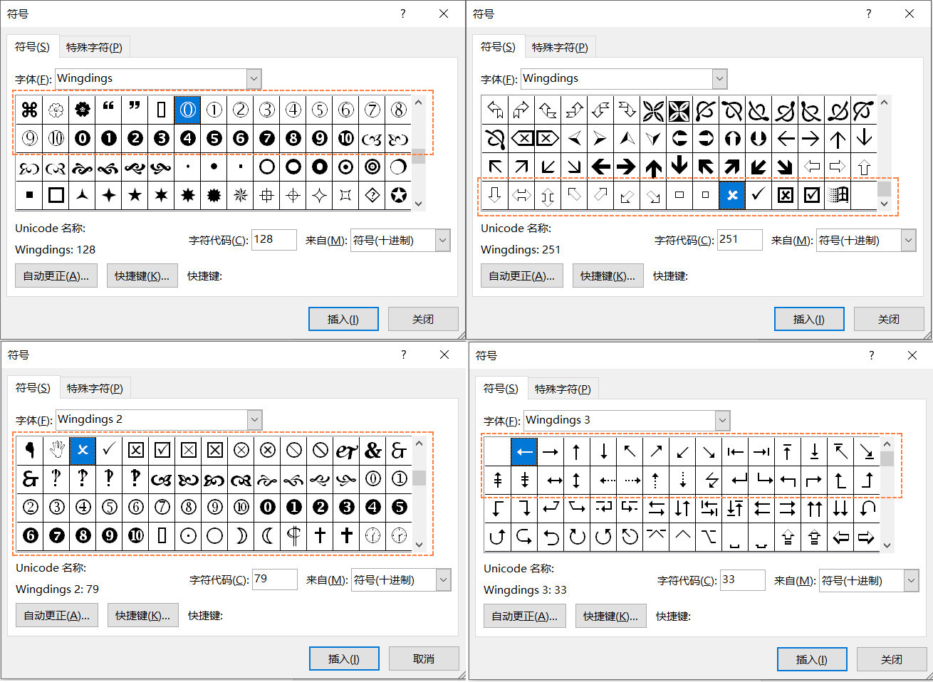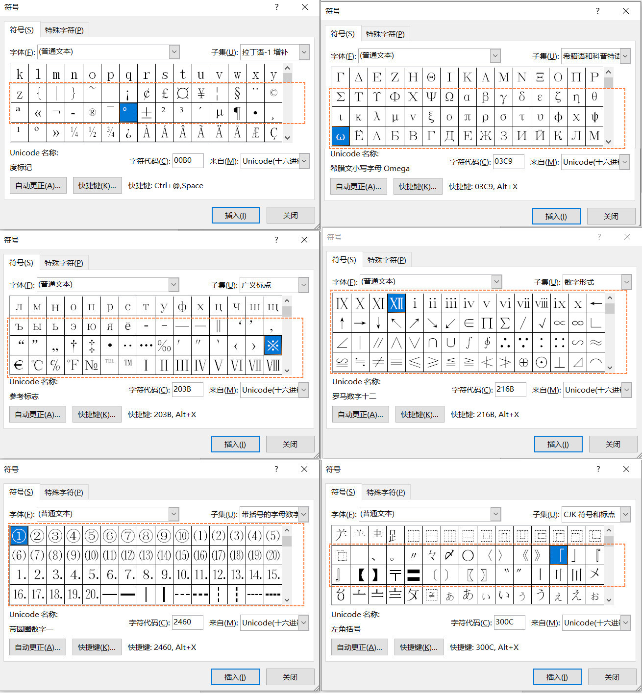 - 在Word中,插入 | 插入符号 | 其他符号(M)…,