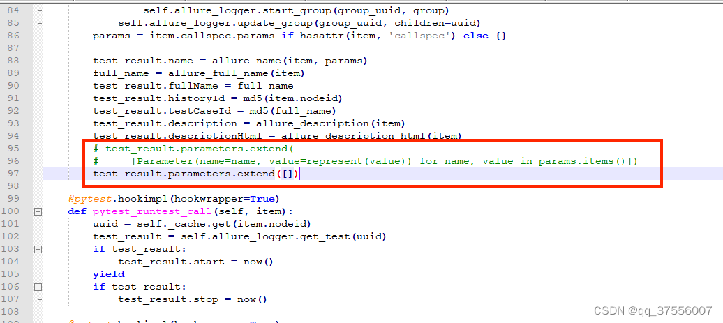 1.首先找到Python安装目录下 \Lib\site-packages\allure_pytest\listener.py 文件,然后将test_result.parameters.extend([]) 中参数改成空列表就行了,具体如下图所示: