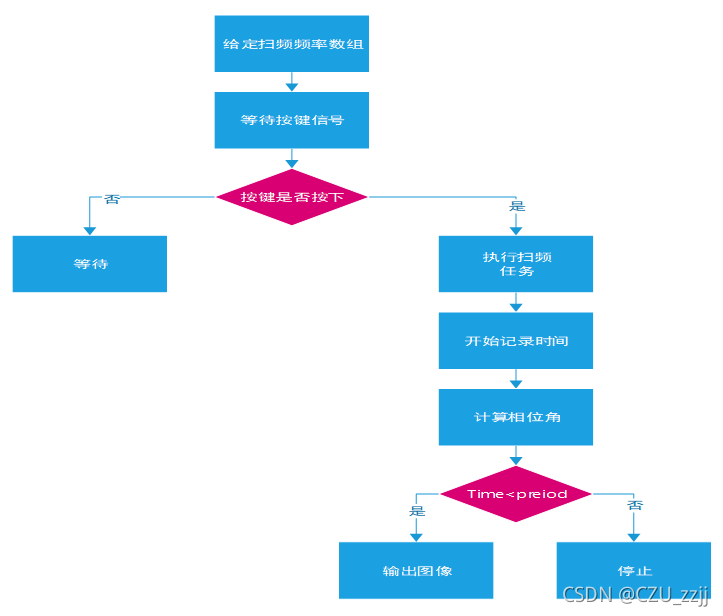 在KEIL工程中编写程序,使其产生频率从1Hz到200Hz变化的正弦信号,每个频率点持续的周期为20。将写好的嵌入式程序下载到A型开发板,当A型开发板按键按下,电机按照给定的频率发送正弦信号,流程图如图2所示: