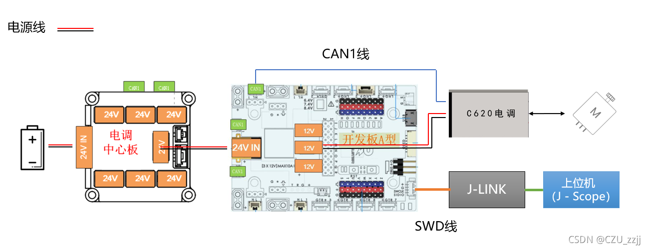 本文使用硬件设备为大疆M3508电机,大疆C620无刷电机调速器,大疆A型开发板,J-LINK调试器,经纬M100 TB47D电池。实验系统软件组成为MATLAB ,KEIL , J-SCOPE 。其设备连接如图1所示: