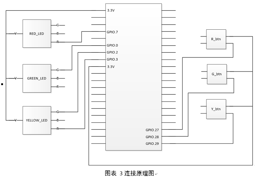 3.1、RGB三色灯有四个引脚,高电平接3.3V,其它三个引脚对应三种色源,对应的引脚输入低电平时灯亮,输入高电平时灯灭。