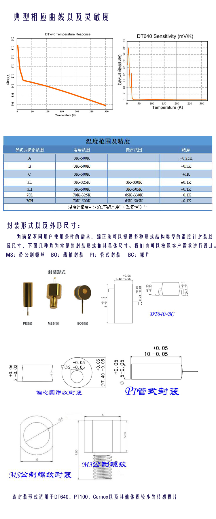 DT640系列硅二极管温度传感器选用了专门适用于低温温度测量的硅二极管。相比普通硅二极管,具有重复性好、离散性小、精度更高温度范围更宽、低温下电压相对高而易于测量等特点。所有此款温度计都较好地遵循一个电压-温度(V-T)曲线,因而具有更好的可互换性。很多应用中都不需要单独的标定。