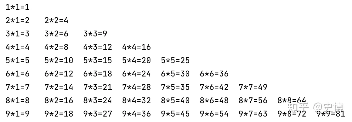 注意 “\t” 的用法,这样可以让乘法表9个9个输出。