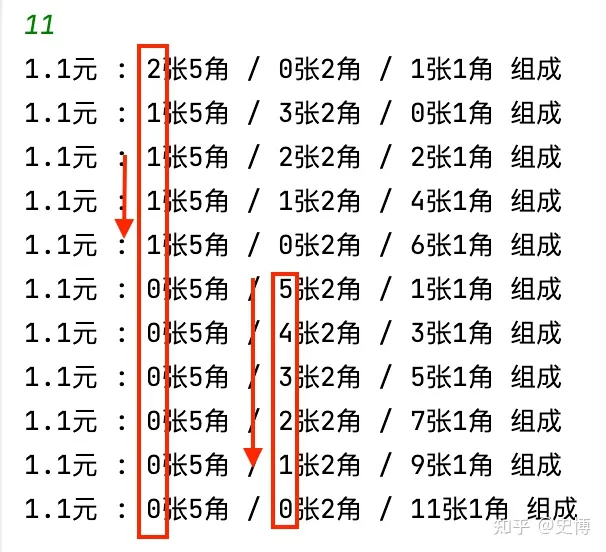 是(1角)的递增循环。然后,用 if 函数,判断 "one + 2* two + 5*five"的值,是否等价于"==" amount 的值。最