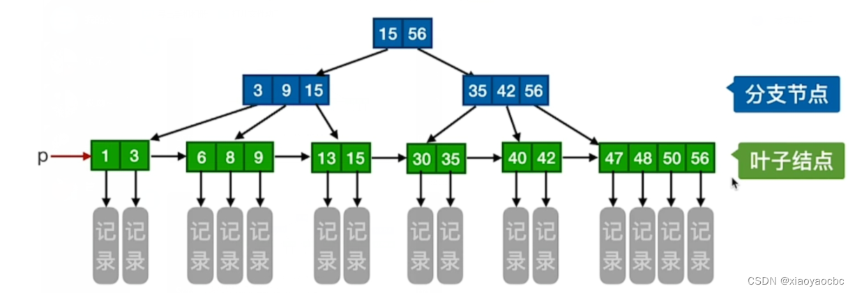 (4)所有叶结点包含全部关键字及指向响应记录的指针,叶结点中将关键字按大小顺序排列,并且相邻叶节点按大小顺序相互链接起来。(支持顺序查找)