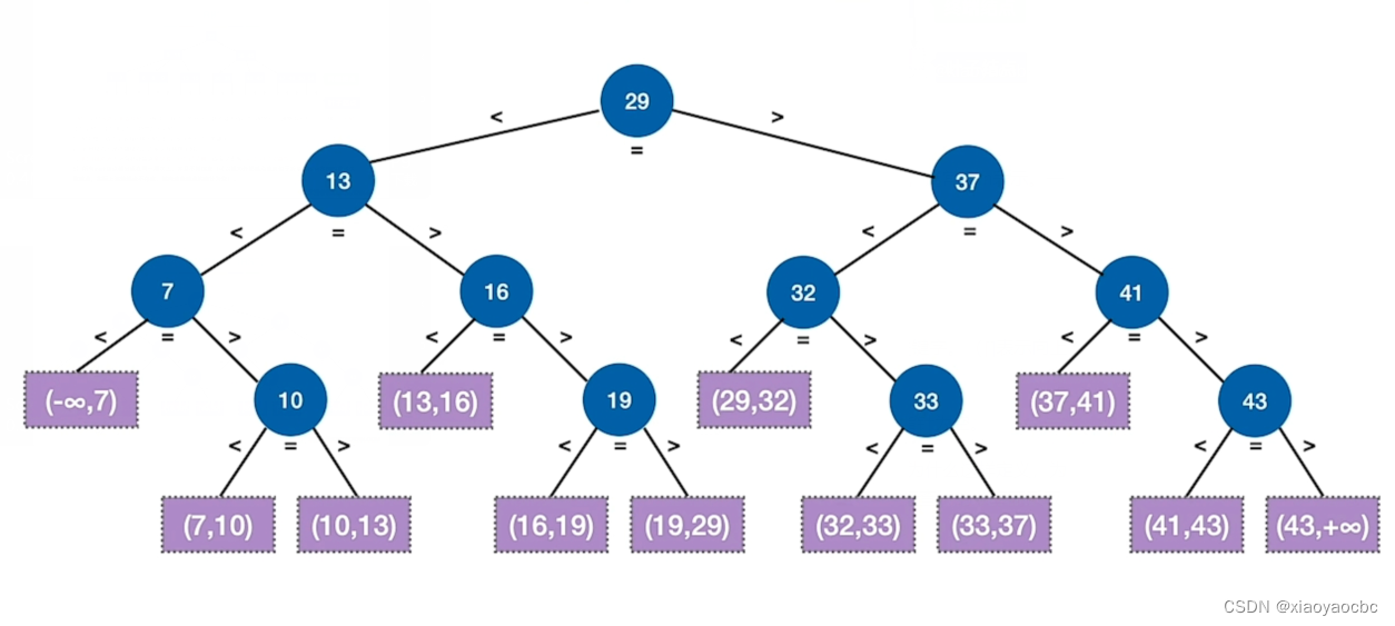 比如说我找20,最后会指向19这个节点的右子树,这个右子树所代表的范围就是(19,29)。