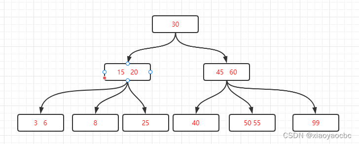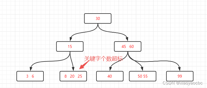从中间节点,即第 ⌈3/2⌉ = 2个节点分开,左边8,中间20,右边25,前半部分留在旧结点中,后半部分复制到新结点中,中间位置的关键字连同新结点的存储位置插入到父结点中。结果变成下图的B树。