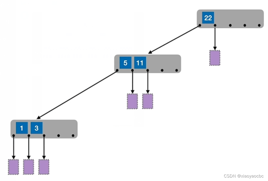如图,这是一个五叉查找树,它和二叉查找树的规律是一样的,只不过二叉查找树的每个节点的关键字都只有一个,而这个五叉查找树的每个节点关键字最多有四个 ,为什么是四个呢?通俗的解释就是因为五叉查找树的每个节点最多有五个孩子节点,也就是说最多可以被划分为五个范围,由小学学习的植树问题可以知道,划分为五个范围需要四个关键字,所以关键字的个数最大值为x-1,x就是x叉树的x,也就是x阶b树的x。而我们又知道,若每个节点内关键字太少,导致树变高,那么我们查找效率就变低了,所以b树采取的策略就是:m阶b数,或者说m叉查找树中,任何节点至少有⌈m/2⌉个分叉,即至少含有⌈m/2⌉-1个关键字。也就是我们定义中的第三点。当然,我们要将根节点除外,因为当这棵树刚输入数据时,比如只有一个数据时,根节点只有两个分叉,是不符合定义的。