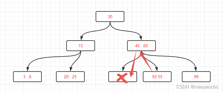 第三种:关键字个数Ñ等于⌈m/2⌉-1,而且被删除关键字所在结点和其相邻的兄弟结点中的关键字数目均等于[M / 2] -1。也就是说无法从兄弟节点借了,那么这个结点就不存在了,兄弟结点就需要合并父亲结点。比如说在上图的基础上继续删除45关键字。