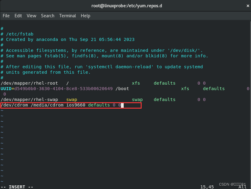 本书前面讲到,软件仓库是一种能进一步简化 RPM 管理软件的难度以及自动分析所需软件包及其依赖关系的技术。可以把 Yum 或 DNF 想象成是一个硕大的软件仓库,里面保存有几乎所有常用的工具,而且只需要说出所需的软件包名称,系统就会自动为您搞定一切。 Yum 与 DNF 软件仓库的配置文件是通用的,也就是说填写好配置文件信息后,这两个软件仓库的命令都是可以正常使用。建议在 RHEL 8 中使用 dnf 作为软件的安装命令,因为它具备更高的效率,而且支持多线程同时安装软件。 搭建并配置软件仓库的大致步骤如下所示。 第 1 步:进入/etc/yum.repos.d/目录中 (因为该目录存放着软件仓库的配置文件) 第 2 步:使用 Vim 编辑器创建一个名为 rhel8.repo 的新配置文件(文件名称可随意,但后缀必须为.repo),逐项写入下面的配置参数并保存退出。 仓库名称: 具有唯一性的标识名称,不应与其他软件仓库发生冲突。 描述信息: 可以是一些介绍性的词,易于识别软件仓库的用处。 仓库位置:软件包的获取方式,可以使用 FTP 或 HTTP 下载,也可以是本地的文件(需要在后面添加 file 参数)。 是否启用: 设置此源是否可用; 1 为可用, 0 为禁用。 是否校验: 设置此源是否校验文件; 1 为校验, 0 为不校验。公钥位置:若上面的参数开启了校验功能,则此处为公钥文件位置。若没有开启,则省略不写。 第 3 步: 按配置参数中所填写的仓库位置挂载光盘,并把光盘挂载信息写入 /etc/fstab 文件中。 第 4 步: 使用“ dnf install httpd -y ”命令检查软件仓库是否已经可用。 进入 /etc/yum.repos.d 目录后创建软件仓库的配置文件: