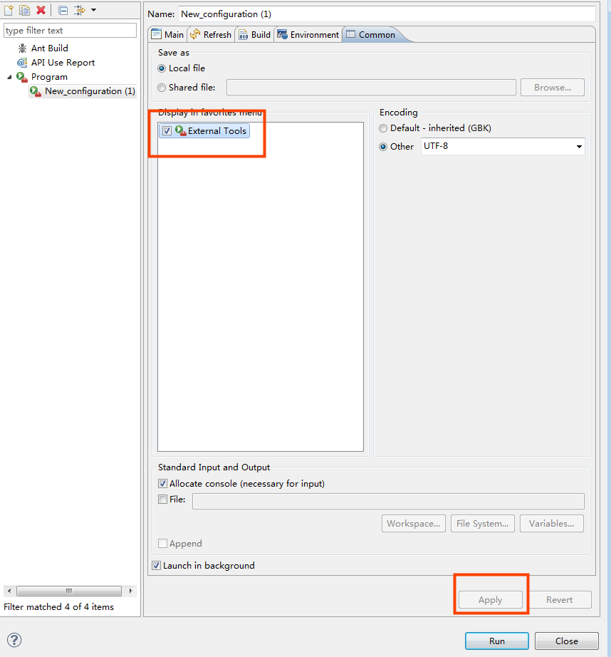 4、切换到Common页签,勾上External Tools,然后点击Apply,最后点击Close即可