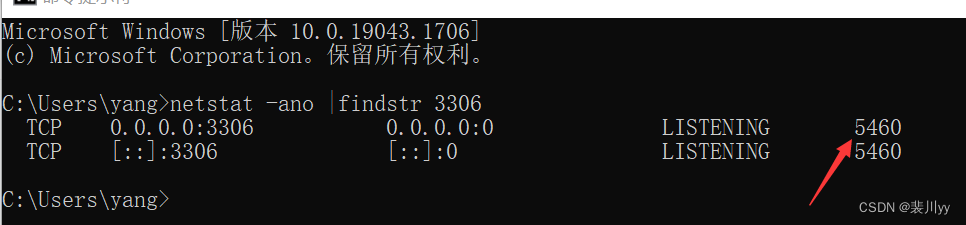 (2)输入命令:netstat -ano |findstr 3306,查看什么占用了3306