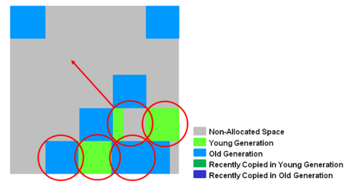 (6)复制/清除过程后。回收区域的活性对象已经被集中回收到深蓝色和深绿色区域。