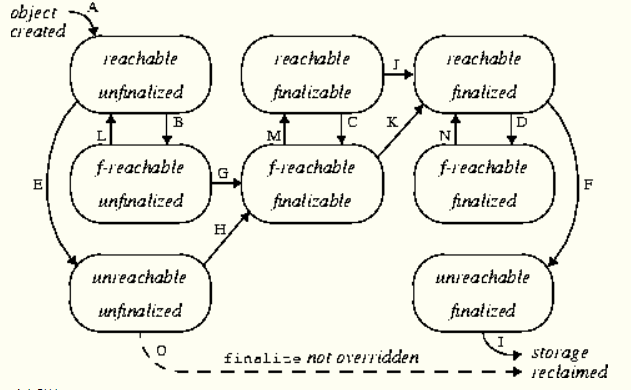 (3)若JVM检测到处于unfinalized状态的对象变成f-reachable或unreachable,JVM会将其标记为finalizable状态(G,H)。若对象原处于[unreachable, unfinalized]状态,则同时将其标记为f-reachable(H)。