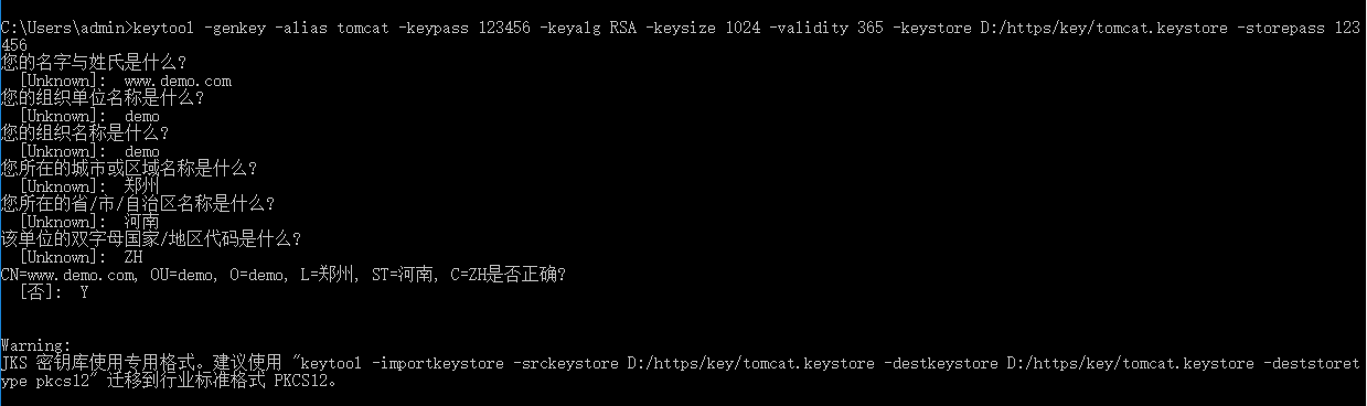 keytool -genkey -alias tomcat -keypass 123456 -keyalg RSA -keysize 1024 -validity 365 -keystore D:/keys/tomcat.keystore -storepass 123456