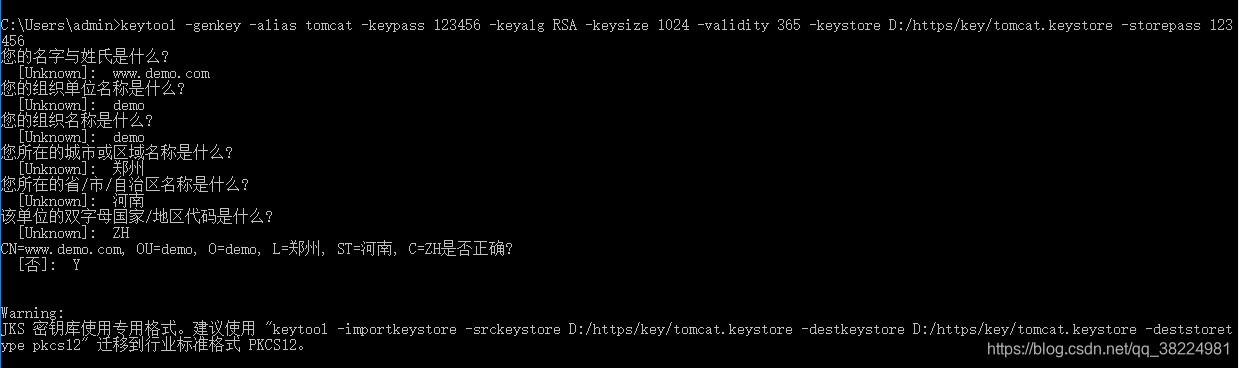 -keystore D:/keys/tomcat.keystore(指定生成证书的位置和证书名称)