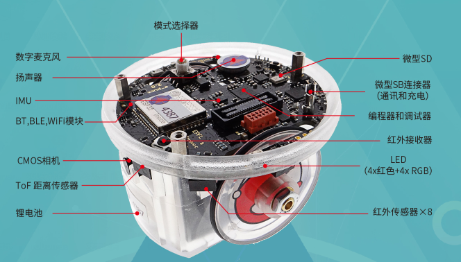 它由STM32F4微型处理器,配有多种先进的传感器:彩色摄像头、WIFI、蓝牙、红外传感器、距离传感器、USB数据口、IMU、麦克风、扬声器、LED灯等,内置标准的Linux运行系统,提供标准C/C++语言开发环境。