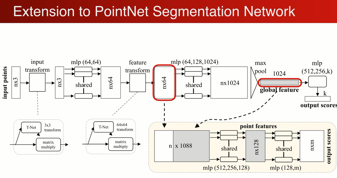 最简单的做法是将全局特征重复N遍,和每一个原来单个点的特征连接在一起,相当于单个点在全局特征中进行了一次检索,检索到在哪个位置就是哪个类别,对连接起来的特征进行MLP的变换,最后输出m类相当于m个score:(将单个点和总体的特征连接到一起,判定在总体中的位置,来决定是哪个分类)