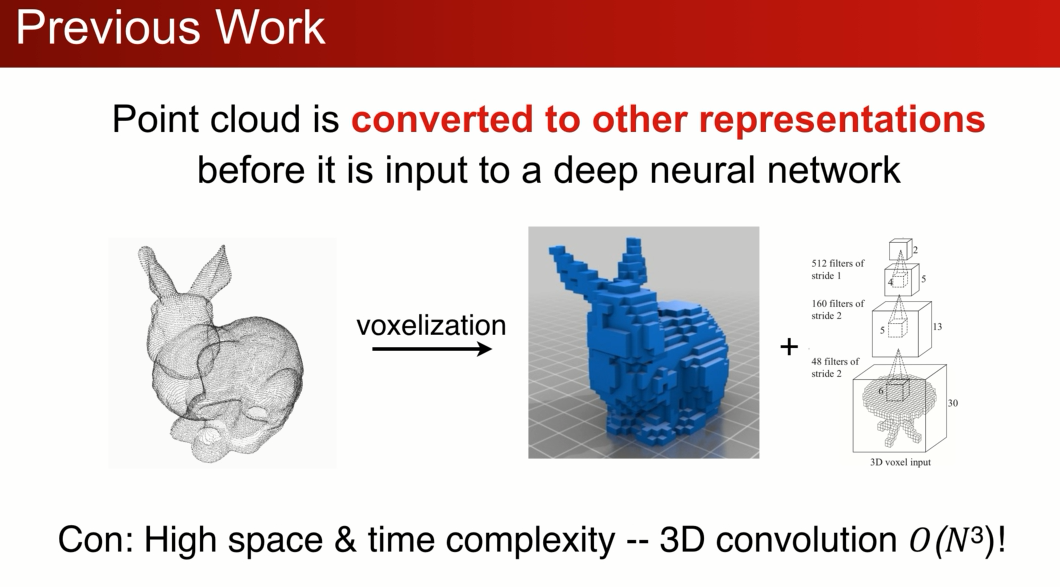 但是点云数据是一种不规则的数据,在空间上和数量上可以任意分布,之前的研究者在点云上会先把它转化成一个规则的数据,比如栅格让其均匀分布,然后再用3D-cnn 来处理栅格数据: