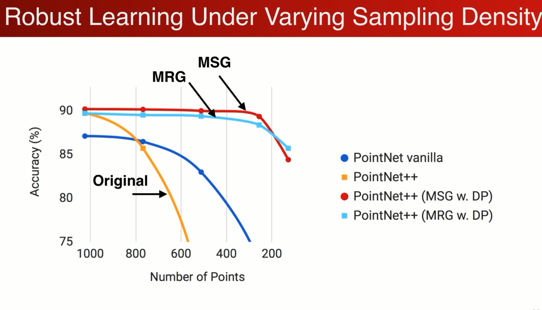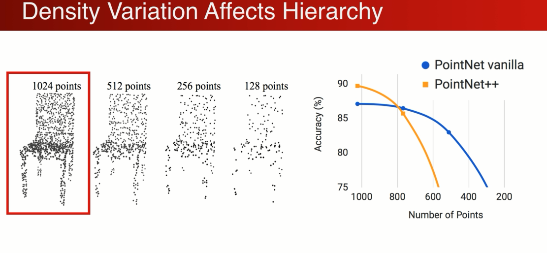 在刚开始1024点的时候point net ++ 更加强大,得到更高的精确度,应为它是在小区域上,随着密度的下降,性能收到了极大的影响,在小于500个点以后性能低于pointnet