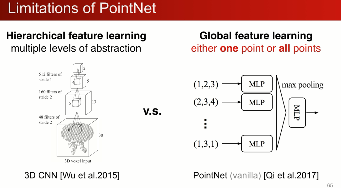 本质上来说,要么对一个点做操作,要么对所有点做操作,实际上没有局部的概念(loal context) ,比较难对精细的特征做学习,在分割上有局限性