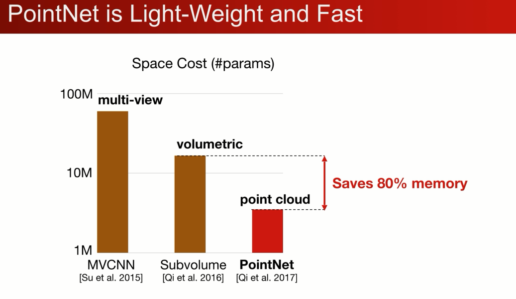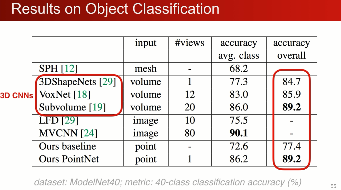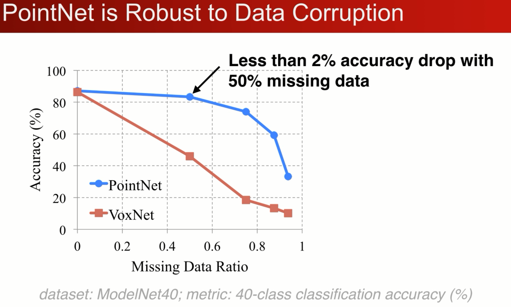 在modelnet 40 的分类问题上,在丢失50%的点的情况下,pointnet仅仅收到2%的影响,与之想想比Voxnet3D精度相差了20%