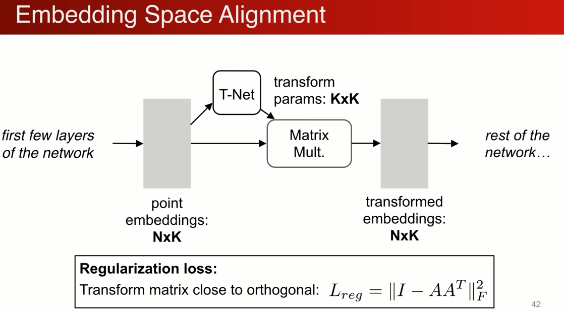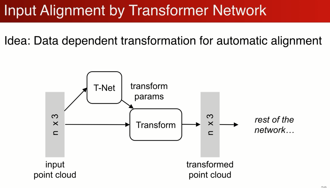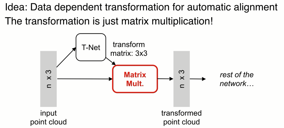 增加了一个基于数据本身的变换函数模块,n个点(x,y,z) t-net 生成变换参数,之后的网络处理变换之后的点,目标是通过整体优化变换网络和后面的网络使得变换函数对齐输入,如果对齐了,不同视角的问题就可以简化。