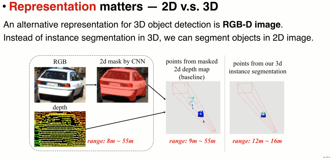 2 选择了3D 分割方法,相比mask-rcn 。将2d mask的depth point 拿出来发现分割效果非常差,原因是:在图片中很近,但是在3d中很远的