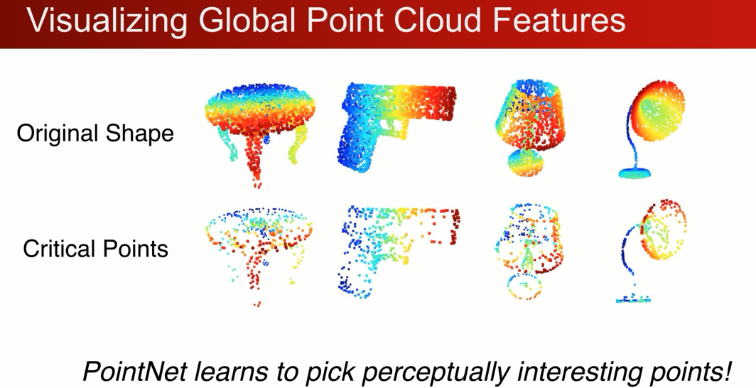 第一行是原始的,我们想知道哪些点对全局特征做出了贡献,maxpooling ,有些点embedded的特征非常小,在经过maxpooling之后对全局特征没有任何的贡献,哪些点是剩下来的胜利者