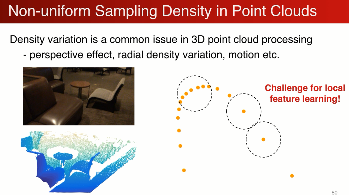 因为pointnet 常见的采样率的不均匀,比如有个depth camera 采到的图像,近的点非常密集,远的点非常稀疏,在密的地方没有问题,在稀疏的会有问题,比如极端的情况,只有一个点,这样学到的特征会非常的不稳定,我们因该避免。