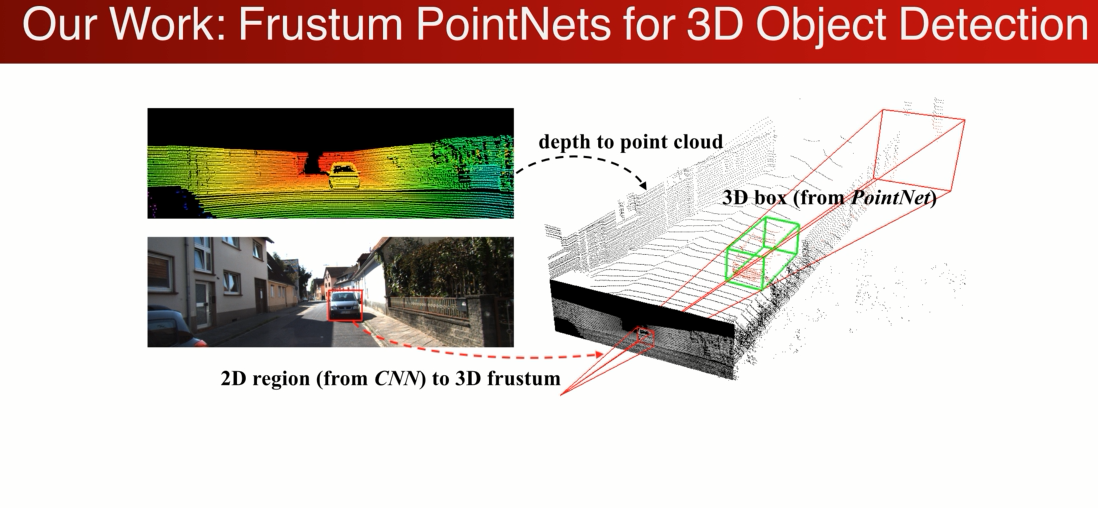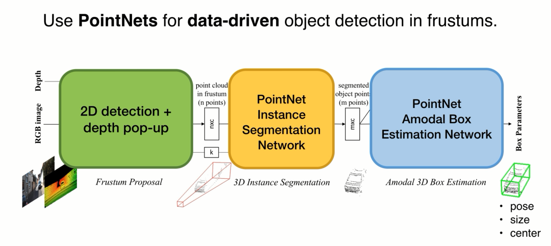1、利用一个2Ddection 将物体检测出来,根据照相机的投影角度参数,可以把2D box 变换到 3d 视锥的范围,在视锥内搜索车在哪里(Frustum Proposal )